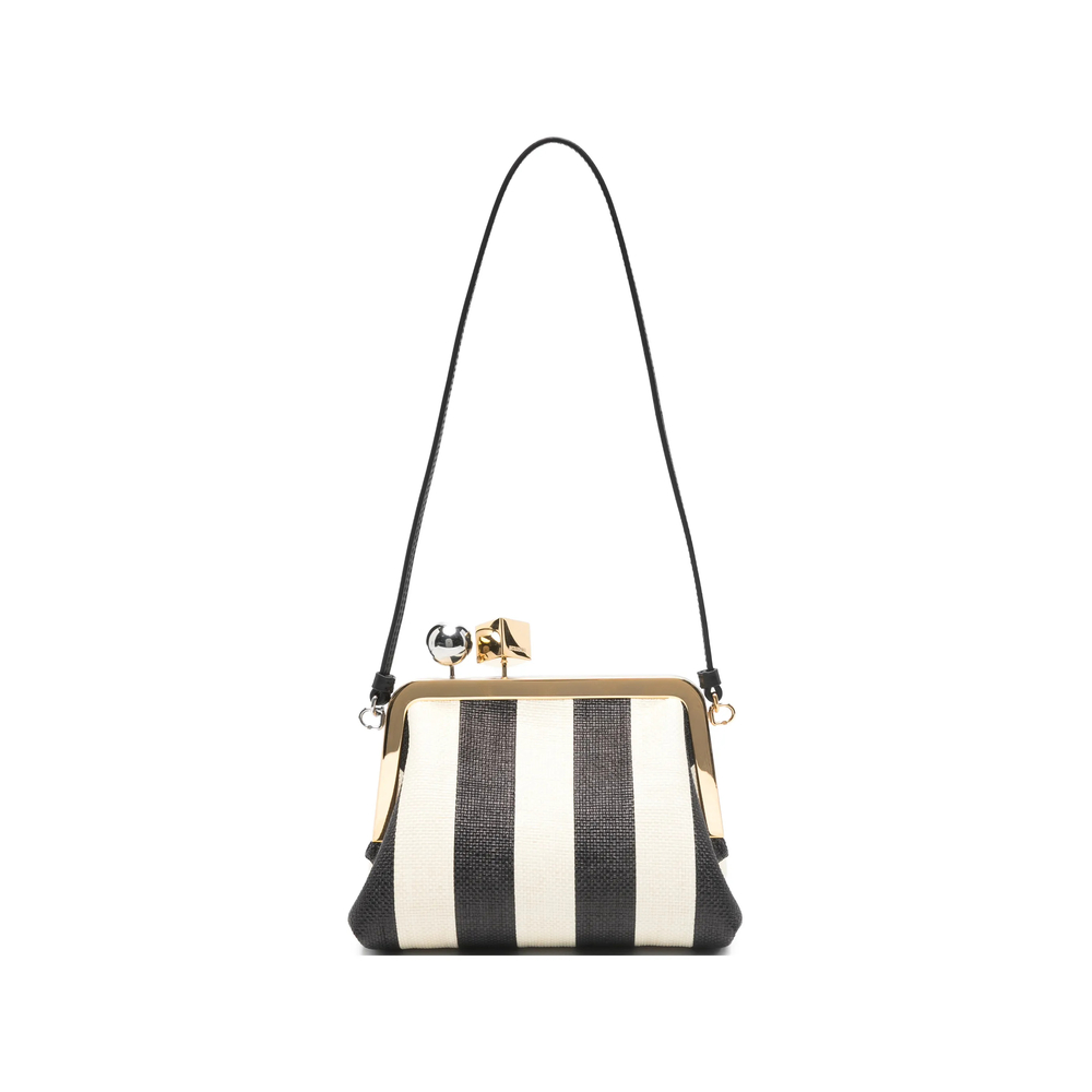 Crafted from high-quality coated canvas, the Jacquemus Le Berlingot Clutch Bag features a beige and black striped pattern that adds a modern twist. The silver-tone hardware, accented with cube and sphere details, does not just serve an aesthetic purpose but enriches the overall conceptual design. Each touchpoint is designed to feel sophisticated and supple against the skin, ensuring that this accessory not only looks luxe but remains durable through prolonged wear.