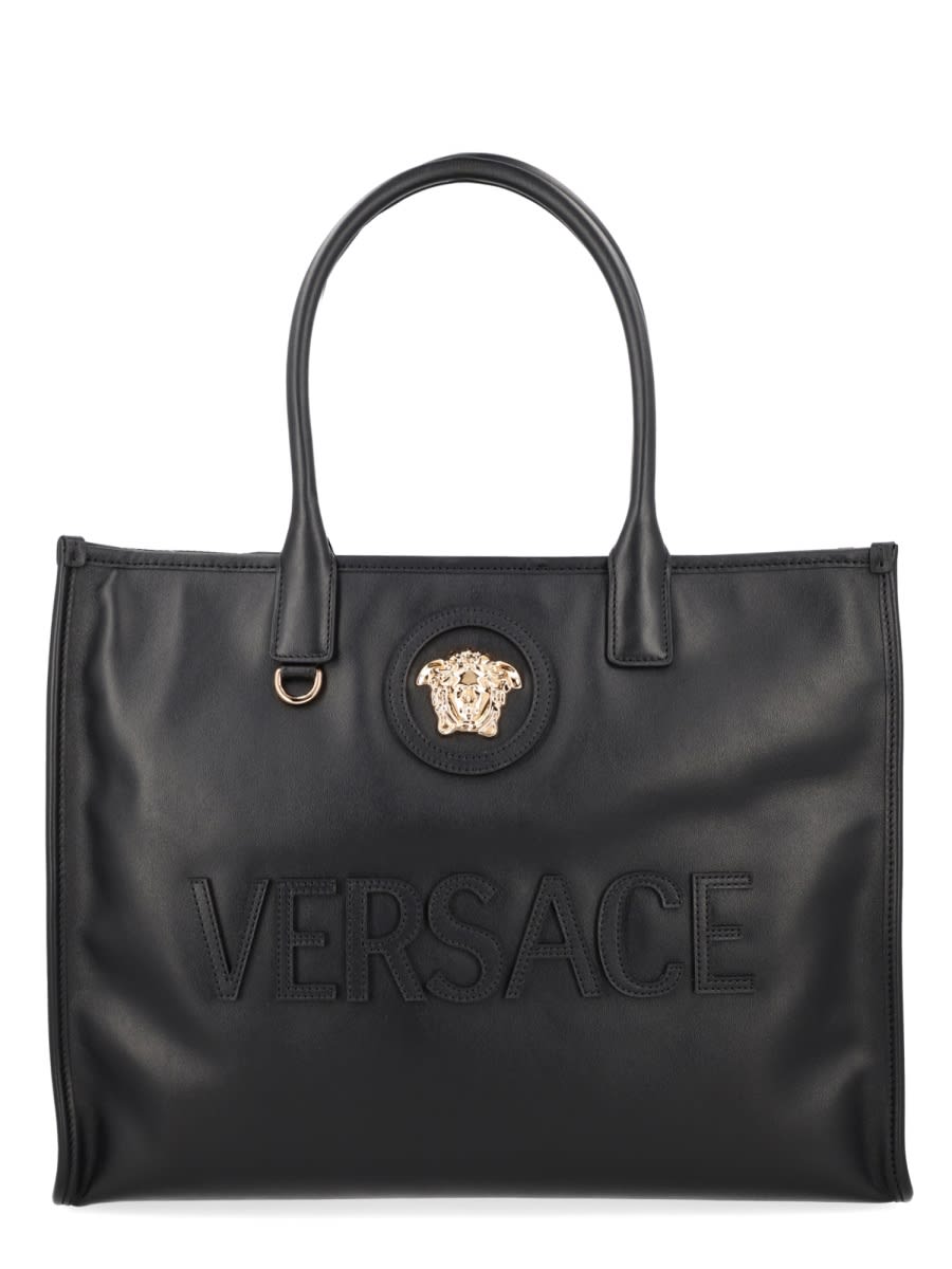 Pair the Versace Tote Bag With Logo with tailored high-waisted trousers and a crisp, silk blouse for an effortlessly chic ensemble. Accent this look with strappy heeled sandals, allowing the iconic logo to stand out as the centerpiece of your outfit.