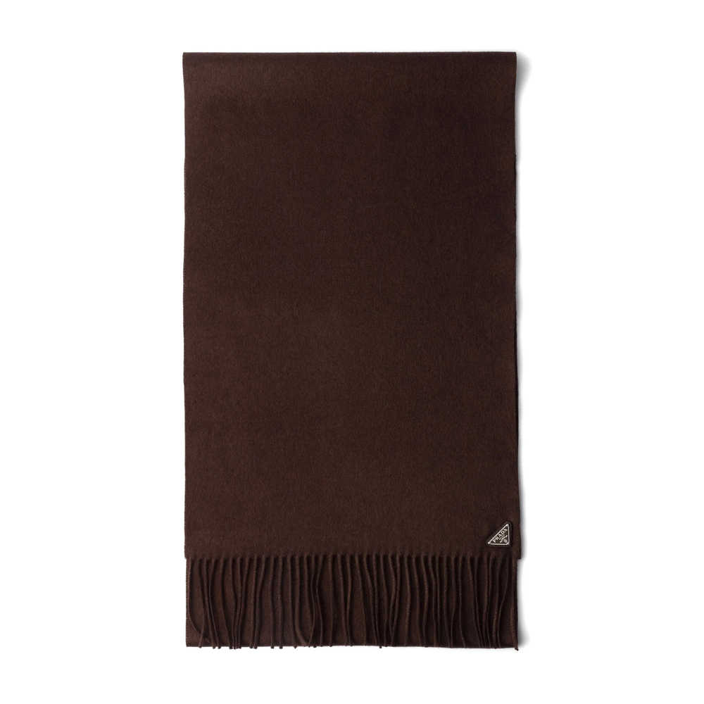 Elevate your accessory game with the Prada Triangle-logo Fringe Scarf. Crafted from a luxurious brown silk-cashmere blend, this scarf combines sophistication with ultimate comfort.
