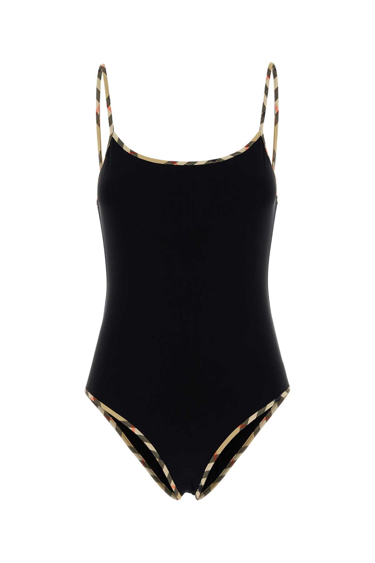 Pair the Burberry Black Stretch Nylon Swimsuit with a flowing white linen cover-up and oversized sunglasses for a chic, beach-ready ensemble. Complement the look with minimalist sandals and a stylish sunhat to create a seamless transition from sunbathing to seaside dining.