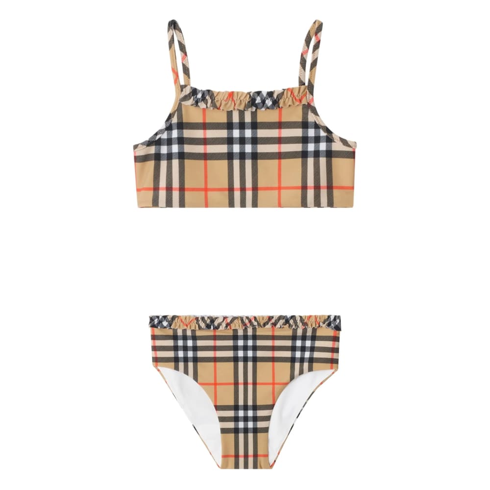 Crafted from a sand beige check print fabric, this beachwear piece showcases a meticulous ruffled trim that transcends mere swimwear into a statement of elegance. Utilizing premium lightweight materials, it feels soft against the skin while providing durability that withstands luxury beach experiences. This fusion of texture and resilience ensures your investment not only appears exquisite but lasts through multiple summers, remaining a swim staple in your closet.