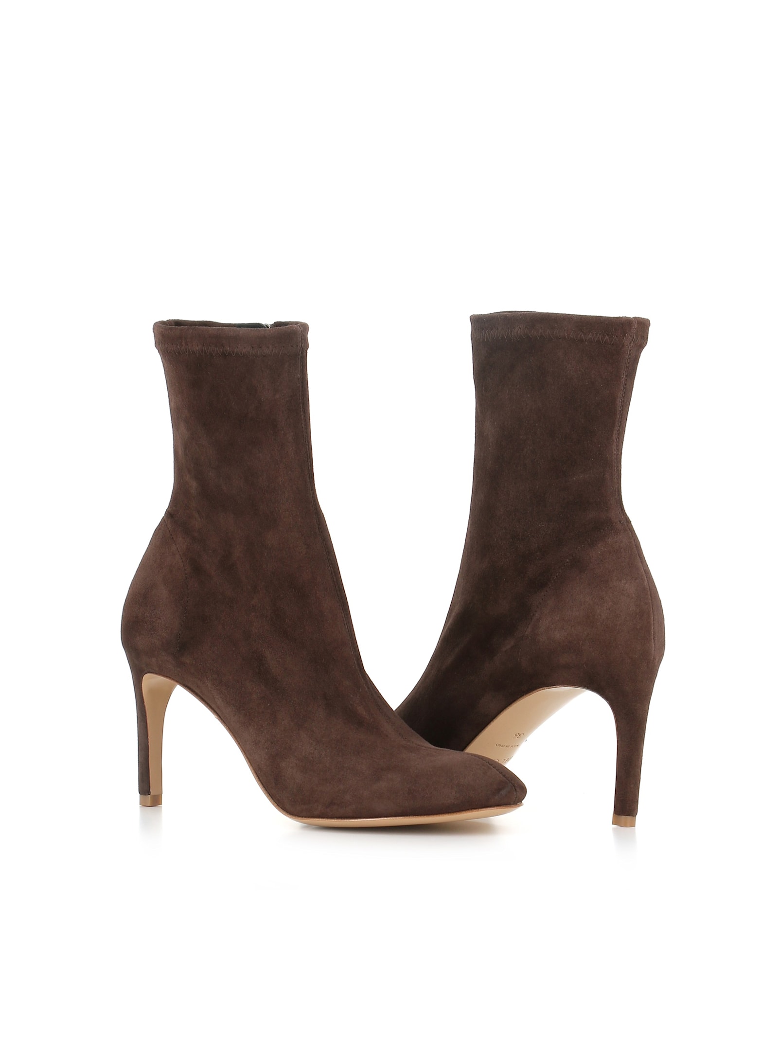 Crafted from dark brown stretch suede, this ankle boot elevates any ensemble with its velvet-like softness and unmistakable luster. The supple, high-quality suede not only caresses the skin but provides impressive durability, ensuring that the boot withstands the test of time while allowing breathability for utmost comfort. The lateral zip fastening promotes an effortless wearability, showcasing premium hardware that enhances both aesthetic and function.